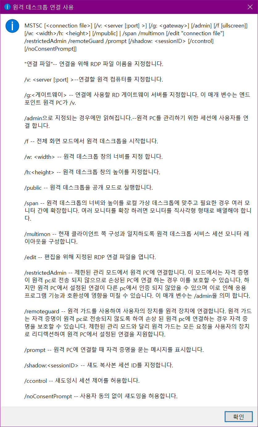 mstsc.exe의 나머지 옵션들에 대한 설명을 보고 싶으면 mstsc /? 로 실행하면 아래와 같은 창이 뜸.